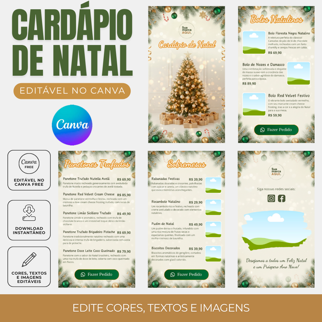 1 Cardápio de Natal, Digital e Interativo com 5 páginas editável no Canva.